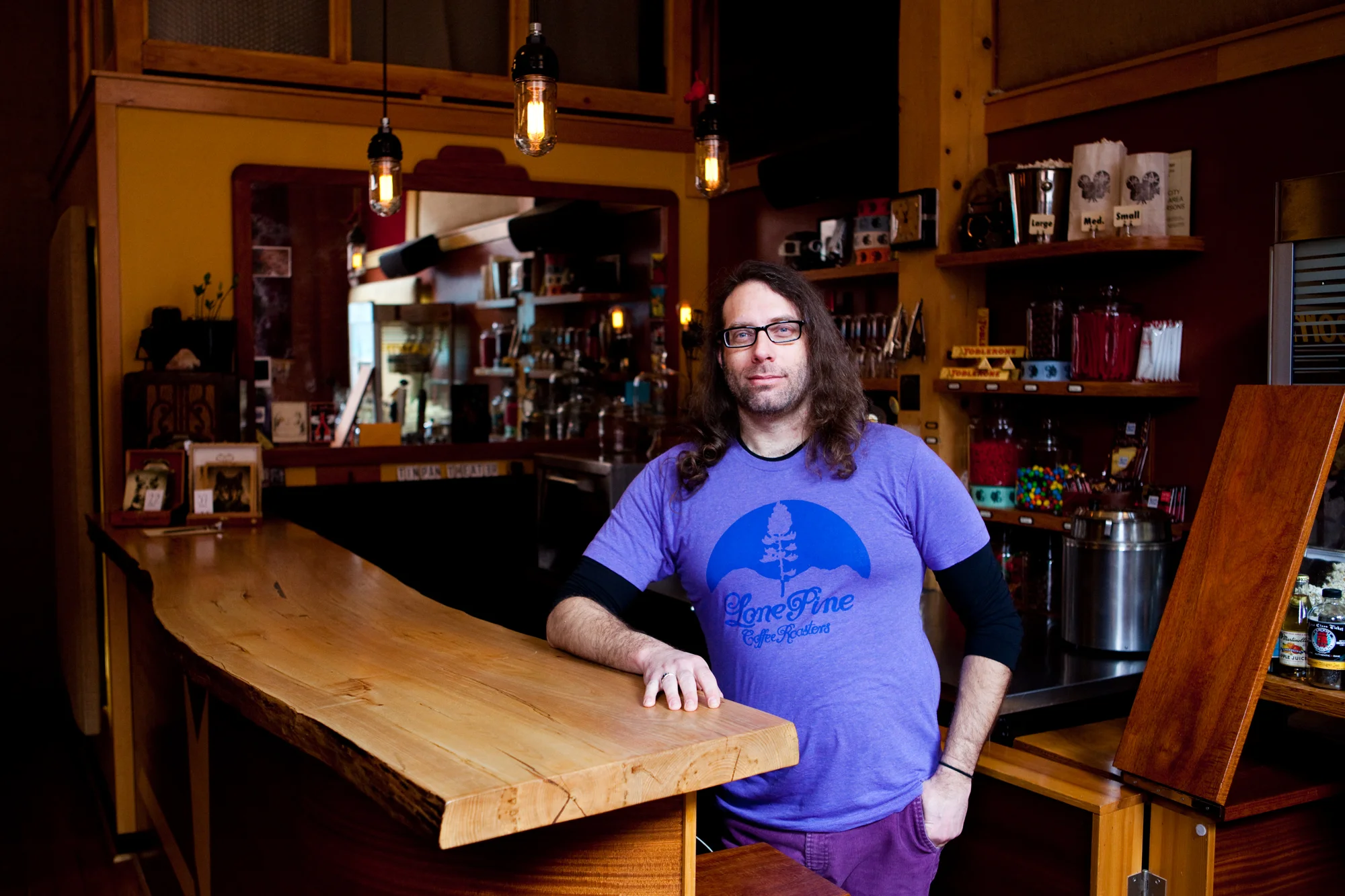 I sit at the coffee shop, I'm a regular next door at Lone Pine Coffee Roasters. My best friend had introduced me to it about six or seven months into my living here and we became regulars there. We play Go, drink coffee, hang out, and then if you are there every day for a year, you are going to get to know a lot of people. You know? I eventually got to know the owners of the theater because they are right next door. One day I was sitting, drinking coffee, and the owner, comes up to me and asks if I would be interested in managing the movie theater. I was thinking to myself that this guy doesn't know me but I'm the perfect person for the job. I worked at Disney Land for 10 years, I was in the entertainment industry, I was a projectionist. It was shocking and I agreed to it. They don't remember it, but two years before that I had come in to see the theater because I had heard it was really cool and asked if they took volunteers and offered to work for free. They turned it down. (Laughs) Other than my brother and the relationships that I've made, this job keeps me here because it's a dream job. It's a job that I never thought I could ever get without having to fight a bunch of other people to get it and there it was, just offered to me on a silver platter. Bend has treated me well, for sure. And I'm lucky to be here.